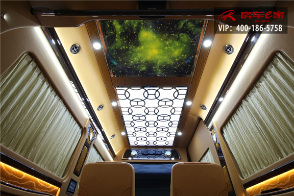 整车被一个中央可升降曲面电视隔开,前后舱成为两部分。有利于个人隐私的交流。乘客舱:搭载有两张独立航空座椅,皮质包覆,带有十项的座椅电动调节、两节舒适腿托、气动按摩、座椅加热通风等丰富功能。后排3人沙发可一键放平成沙发床,可供两人平躺休息。吧台处精心置入了2张隐藏式的独立秘书座椅,方便商务交谈,完美实现隐藏9座座椅布局。冰箱、咖啡机、BOSE音响系统、前后舱对讲机、4G无线WIFI、55寸电动隔断升降曲屏液晶屏等配置使得办公、休闲都十分便利。