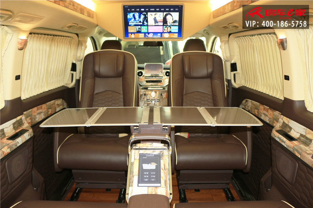 乘客舱第三排豪华VIP座椅亦带有6向调节,通风、加热、按摩,带有二阶腿托更适合休憩。第三排的中央控制系统可以控制整车灯光、贵宾舱4座豪华VIP座椅的功能、电动隐藏式桌板。