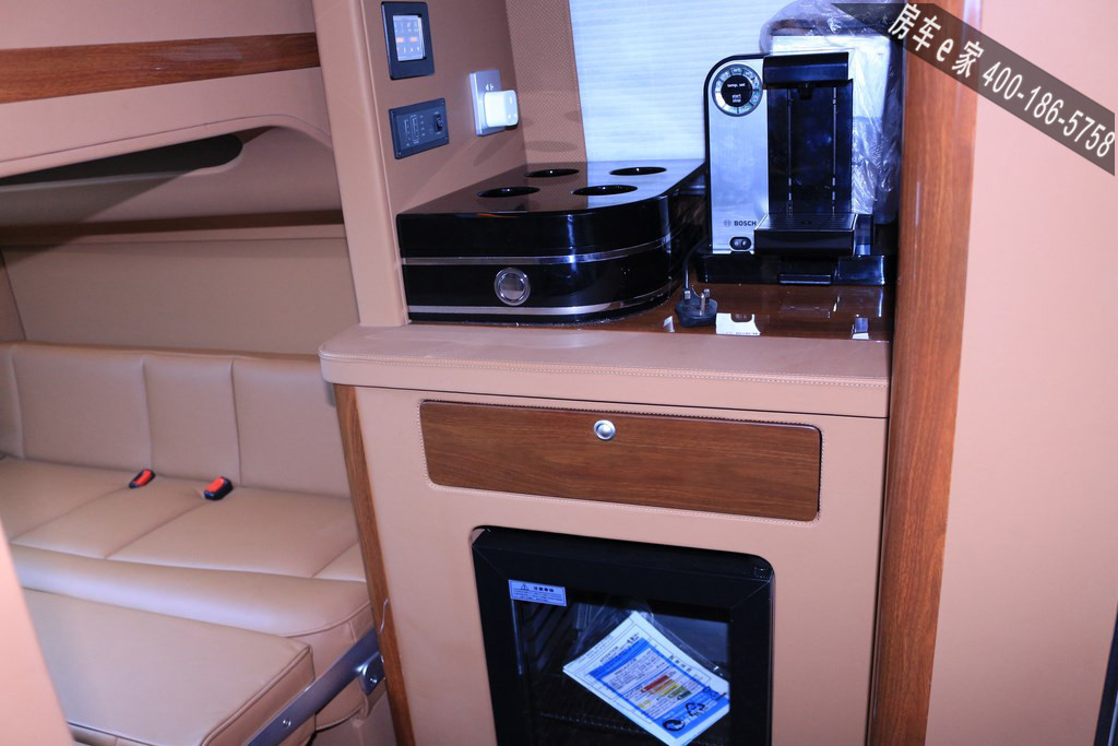 整车的功能布局分布:在车门附近有个柜子,柜子向外的一面有一个可折叠的桌子,和一个外部水龙头;柜子的另一面有一个电蒸箱,内部的柜子下面是个冰箱,冰箱上面是抽屉,柜子上面放了杯托,杯托边上是多功能咖啡机;柜子附近墙上有一个插座和小型的触摸控制屏,可以控制升降沙发和电动升降桌。