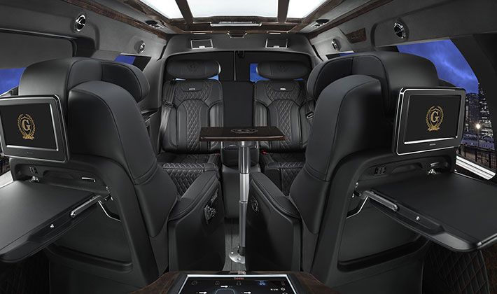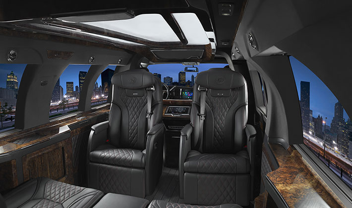 ※后舱湾流经典型豪华航空椅 ※后舱座椅电动腿托/电动靠背后舱座椅气压式按摩 ※第二排航空椅电动前后/旋转后舱座椅电动通风/加热 ※第三排左右独立电动沙发椅 ※倒车/车侧彩色影像监控系统4G移动WiFi/12V电源插口 ※后舱10”多功能触摸屏控制系统 ※后舱多功能瀑布型中控台 ※前舱一体式扶手台电动折叠办公桌 ※前舱门饰板皮饰包覆 ※车载多媒体共享系统/外置USB接口 ※椅背折叠办公桌 ※前舱仪表板皮饰包覆 ※一体式观景隔热私密玻璃 ※观景窗电动私密窗帘 ※氛围灯后舱个人独立控制系统 ※隐置式电动酒柜 ※可变色天逸车内顶 ※电动天窗 ※钢质中门迎宾踏板 ※后舱豪华高光饰板 ※车载制冰型冰箱 ※钢质前门踏板 ※后舱经典型豪华木地板 ※HARMAN专用喇叭罩隐置式电热水壶 ※镀铬出风口/LED阅读灯 ※专用金属饰标